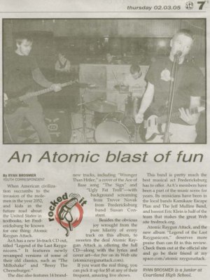 February 22- Our cd release show on the second went awesome! We've been getting quite a few downloads of the new album too, so that's pretty exciting. Tell your friends about it...after all, it's free. Oh, last week there was an artical in the local paper about us. Here's a scan of it. Click on it to make it, you know...big.